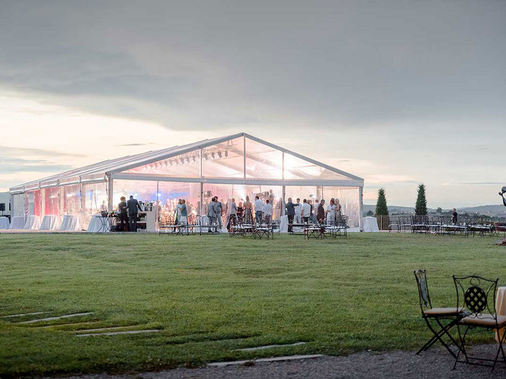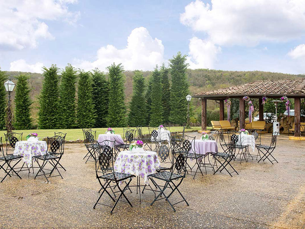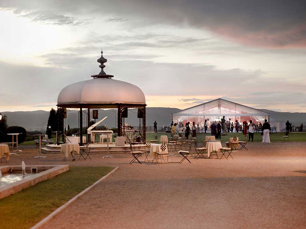 Elegante Sala banchetti e La terrazza sul mondo con vista sulla Tenuta, Campi da Golf e Siena sullo sfondo